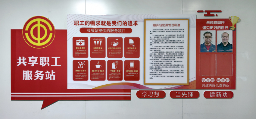 11月25日,公司第一個(gè)共享職工服務(wù)站在包裝中心成立并投入使用。共享職工服務(wù)站文化墻上醒目地提示著共享服務(wù)項(xiàng)目、使用管理辦法,為了豐富文化墻內(nèi)容,還增添了“與榜樣同行遇見(jiàn)更好的自己”優(yōu)秀員工光榮榜。共享職工服務(wù)站內(nèi)共享物品齊全,擺放整齊,共享設(shè)施設(shè)備即符合藥企規(guī)范,也充滿溫馨,充滿愛(ài)意。服務(wù)站提供的服務(wù)項(xiàng)目包括:1、愛(ài)心服務(wù)柜。愛(ài)心服務(wù)柜備用日常應(yīng)急藥品,以備不時(shí)之需;包裝中心員工每天高效、重復(fù)的包裝動(dòng)作很容易被包材劃傷手部,愛(ài)心服務(wù)柜為包裝崗位員工配備了處理傷口的藥品和防護(hù)用品。2、公用雨傘。雨雪天氣,為特殊需要的員工提供共享雨傘。3、白鋼洗手池+熱水器+洗手液。洗手池帶有冷、熱水調(diào)節(jié)開關(guān),讓員工在寒冷的天氣里,能夠使用溫水洗手,暖手暖心。4、洗手烘干機(jī)。員工進(jìn)入操作間洗手后及時(shí)烘干,確保員工衛(wèi)生安全。5、酒精手消毒機(jī)。包裝人員在進(jìn)入包裝間前雙手要進(jìn)行酒精消毒,以保證衛(wèi)生,同時(shí)防止交叉感染和病從手入。6、多層水杯柜+保溫杯。為每一名員工配備了大容量保溫杯,統(tǒng)一存放在多層水杯柜中,根據(jù)姓名、編號(hào),員工可以快捷地找到自己的水杯,為員工喝熱水提供方便,環(huán)境也更加美觀整潔。7、手指套+手套。服務(wù)站為常年進(jìn)行手工操作的包裝人員配備了手指套和手套特殊的勞保用品,保護(hù)員工減少手部磨損和受傷。8、立式手機(jī)充電站+多孔插排。方便員工各種品牌、型號(hào)的手機(jī)充電需要。